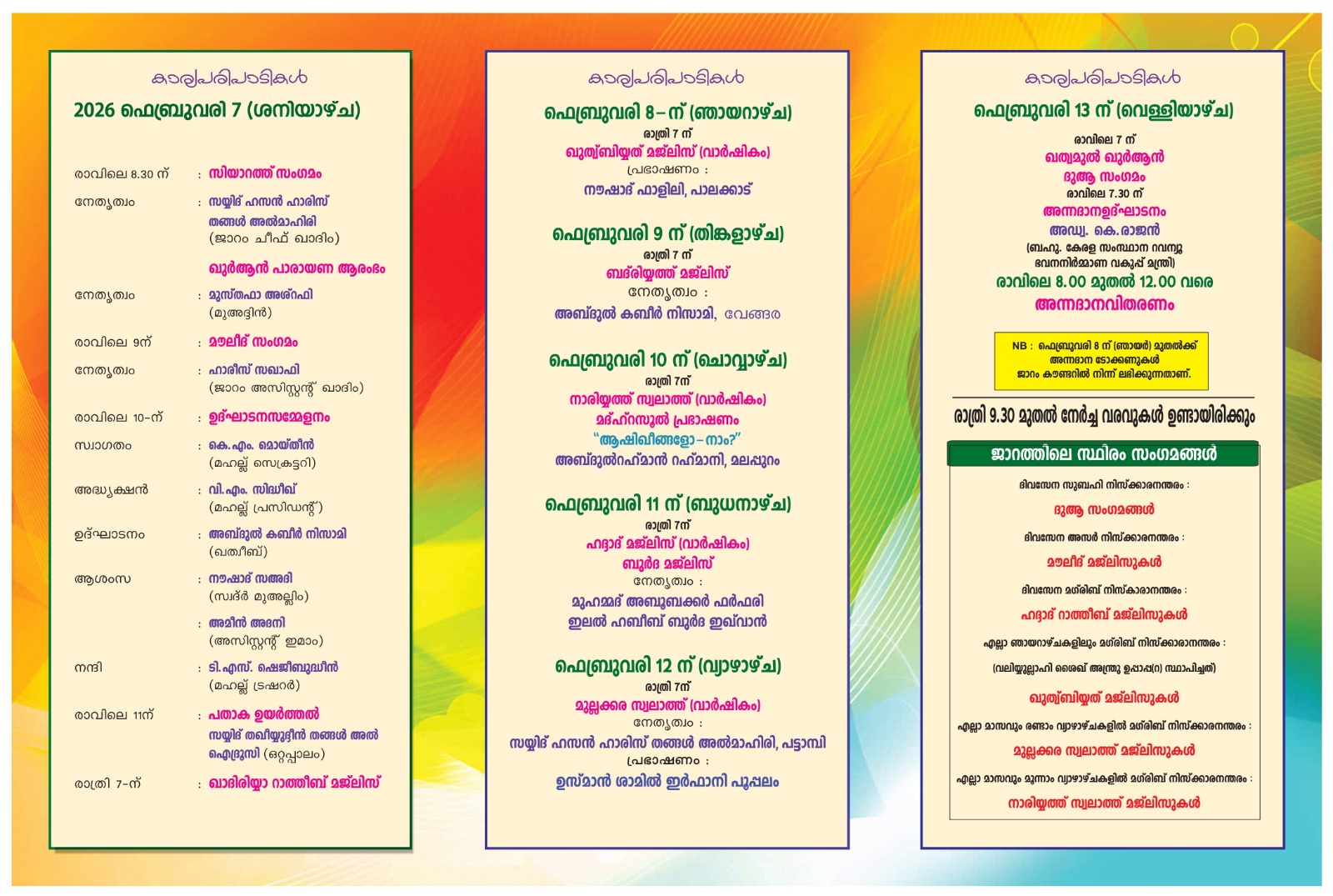 13-ന് രാവിലെ എട്ടുമുതൽ 12 വരെ ടോക്കൺ പ്രകാരം അന്നദാനം വിതരണം ചെയ്യും. അന്നദാന ഉദ്ഘാടനം മന്ത്രി കെ. രാജൻ നിർ വഹിക്കും. നേർച്ചയുടെ ഒരുക്കങ്ങൾ പൂർത്തിയായതായി മുല്ലക്കര മഹല്ല് ജമാഅത്ത് ഭാരവാഹികൾ അറിയിച്ചു.