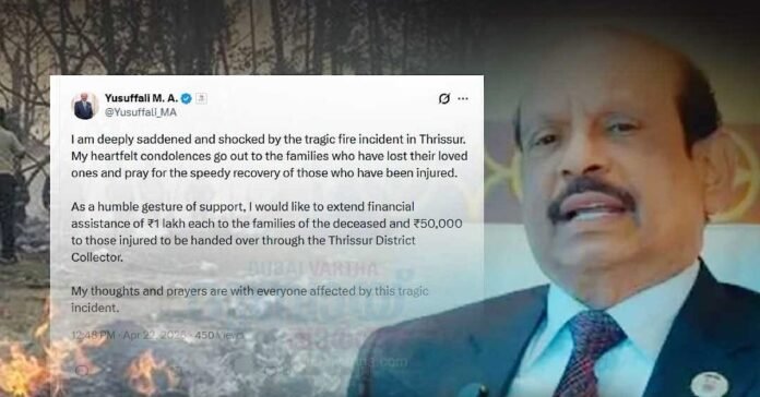 തൃശ്ശൂർ വെടിക്കെട്ട് പുര അപകടത്തിൽപ്പെട്ടവരുടെ കുടുംബത്തിന് സഹായം പ്രഖ്യാപിച്ച് . ലുലു ഗ്രൂപ്പ് ചെയർമാൻ എംഎ യൂസഫലി അനുശോചനം രേഖപ്പെടുത്തി. മരിച്ചവരുടെ കുടുംബത്തിന് ഒരു ലക്ഷം രൂപ വീതം നൽകും. പരിക്കേറ്റവർക്ക് 50,000 രൂപ വീതവും നൽകും. ജില്ലാ കളക്ടർ മുഖേന സഹായം നൽകുമന്ന് എംഎ യൂസഫലി അറിയിച്ചു.