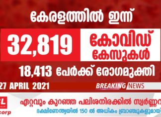 കേരളത്തില് ഇന്ന് 32,819 പേര്ക്ക് കോവിഡ്-19 സ്ഥിരീകരിച്ചു.