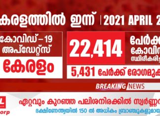 കേരളത്തില് ഇന്ന് 22,414 പേര്ക്ക് കോവിഡ്-19 സ്ഥിരീകരിച്ചു..