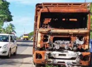 മാസങ്ങളായിട്ടും കത്തി നശിച്ച ലോറി മാറ്റാതെ ദേശീയ പാതയോരത്ത്..